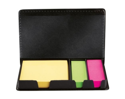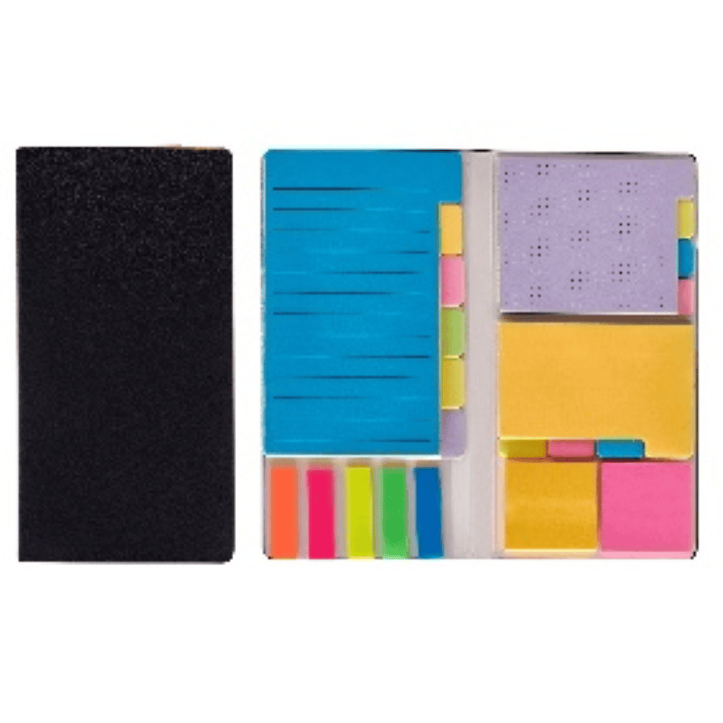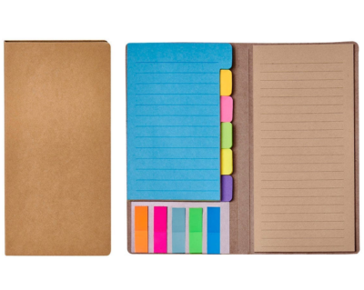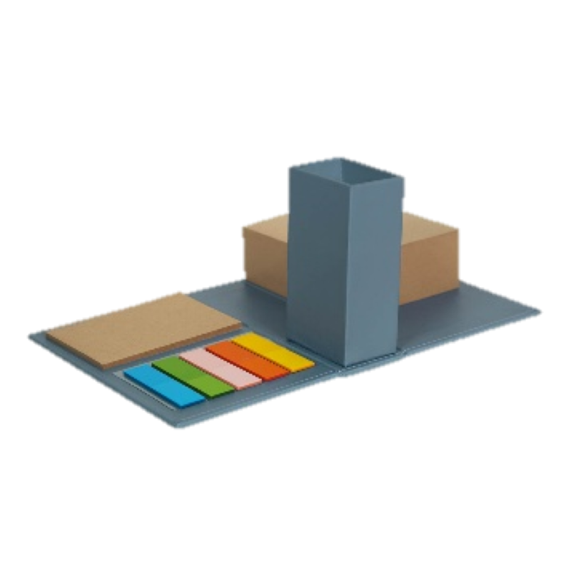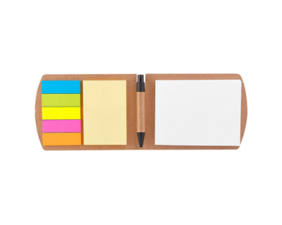 PORTA NOTAS KUSLIG PLEGABLE CON CUBIERTA RÍGIDA DE CARTÓN. INCLUYE UN PORTA LÁPICES, BLOCK DE 270 NOTAS Y 25 NOTAS ADHESIVAS DE PAPEL KRAFT, 5 COLORES DIFERENTES DE BANDERINES ADHESIVOS, CADA UNO CON 15 NOTAS.