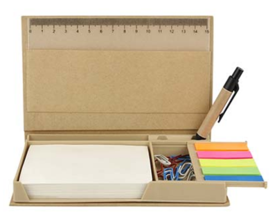 PORTA NOTAS ECOLÓGICO INCLUYE BOLÍGRAFO ECOLÓGICO, PORTA PLUMAS, REGLA DE 15 CM, CLIPS Y NOTAS ADHERIBLES: 100 EN COLOR BEIGE Y BANDERAS DE COLORES.