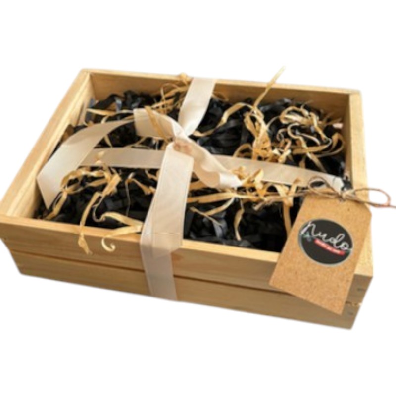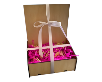 CAJA DE MADERA, 25 X 15 X 11 CMS. INCLUYE LOGO GRABADO, FOLLAJE DE PAPEL O MADERA TRITURADA