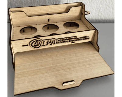 ORGANIZADOR DE MADERA CON DIVISIONES PARA COLOCAR FRASCOS DE MUESTRAS PARA MÉDICOS, INCLUYE LOGOTIPO O NOMBRE GRABADO, PARTE INFERIOR DESLIZABLE PARA COLOCAR LAS ORDENES
